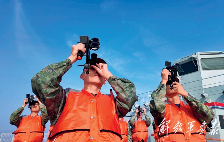实习学员在甲板上进行观测训练。