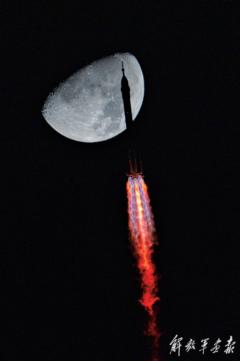 10月31日晚,搭载神舟二十一号载人飞船的长征二号F遥二十一运载火箭在酒泉卫星发射中心点火发射升空,一箭穿月。(摄影/葛利鑫)