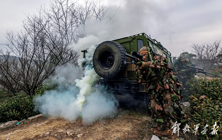 官兵刚抵达预定地域,“敌情”突至,车辆因遭“敌”袭击失去动力。指挥员命令队员下车,分散站位快速抢占射击位置。