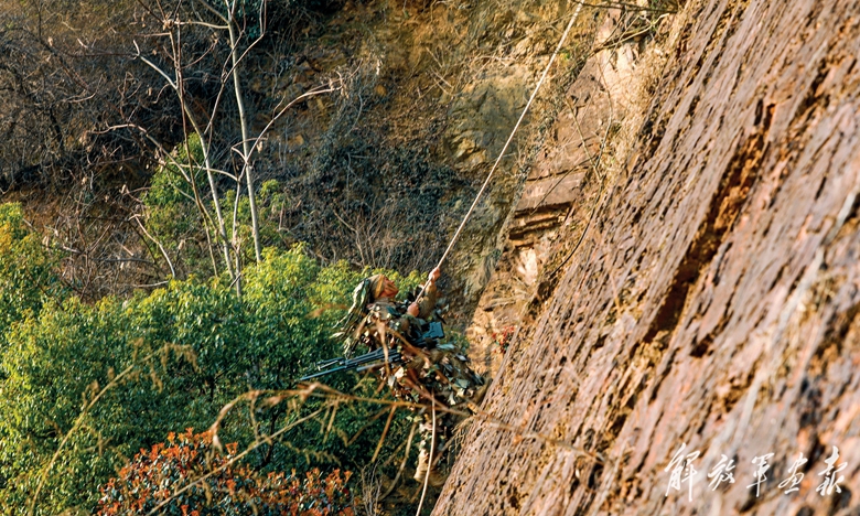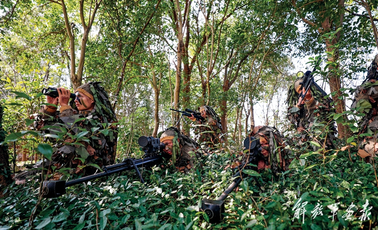 “敌”暗我明,局势不利。无人机手放飞无人机,仪器侦察组组装侦察雷达,分别从空中和地面搜索“敌”踪迹。不多时,雷达捕捉到隐藏在密林之中的目标信息,狙击手果断开火,精准射杀目标。之后,队员们涉水、攀崖,穿越封锁线,交替掩护进入山顶松林,直插 “敌”心脏地带,成功摧毁多个目标。