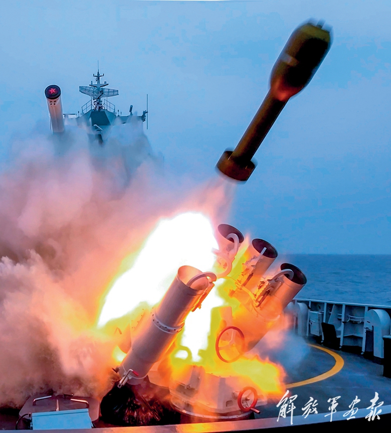 硝烟未散,“敌情”又至。雷达战位官兵紧急上报,发现“敌”导弹来袭。编队各舰快速机动,迅即形成对空防御阵形。干扰弹破膛而出,在海天间构筑起一道屏障。副炮战位持续跟踪瞄准,官兵抓住最佳抗击时机,果断按下击发按钮,成功拦截目标。