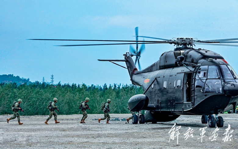 此时,先期渗透上岸的突击队员已悄然抵近“敌”前沿,迅速展开侦察行动,将获取的目标信息实时回传。盘旋待战的武装直升机闻令而动,依据情报实施连续火力覆盖,成功开辟机降场域。