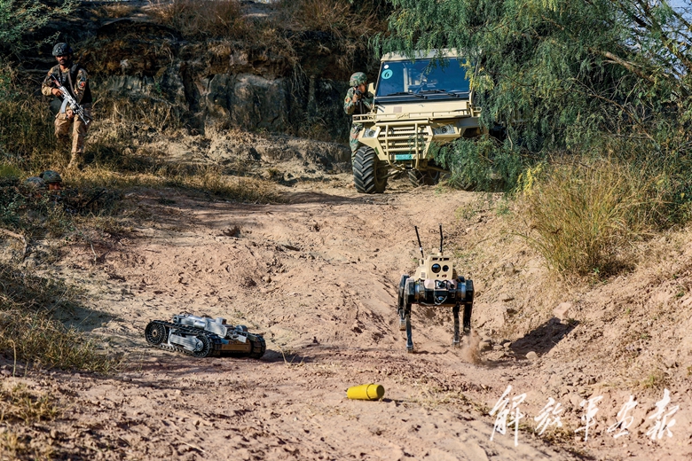 参演部队在机动中使用机器狗和排爆机器人排除简易爆炸物。