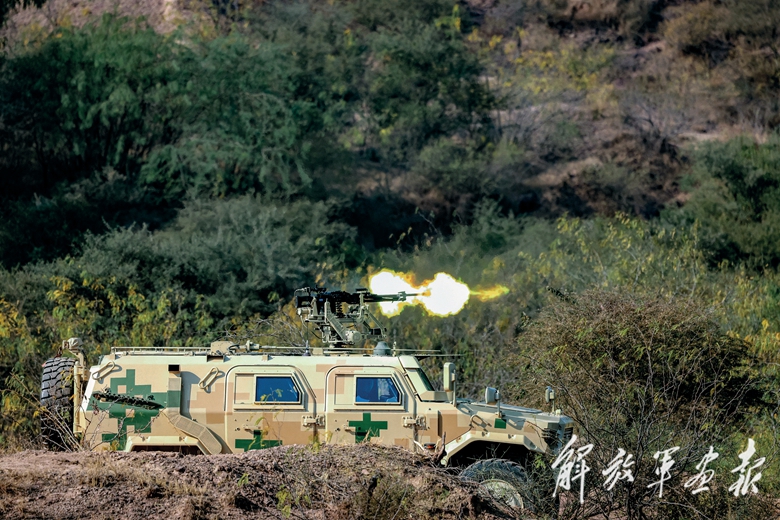 中方参演部队使用车载遥控武器站对目标实施火力压制。