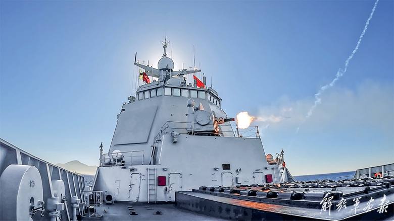 唐山舰副炮射击。