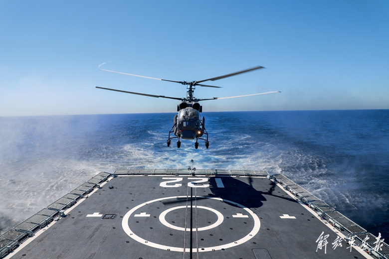 当地时间1月14日,中方海军唐山舰协同俄方直升机进行着舰训练。