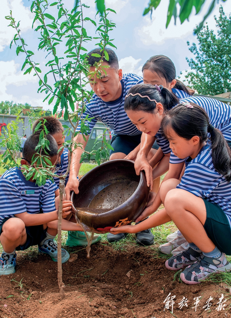 该部为此次活动专门设计了一场“五方水土汇聚”仪式。4所援建学校的学生,从雪域高原、天山脚下、黔贵大地、沂蒙老区,带来家乡的水和土。他们与该部军人子女一起,将来自各地的水土一起倒入“同心盆”内。随后,海军官兵和学生们共同种下一棵象征着民族团结的石榴树,并将来自五地的水土培在小树周围。