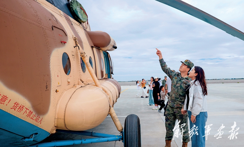 官兵带领家属参观直升机。