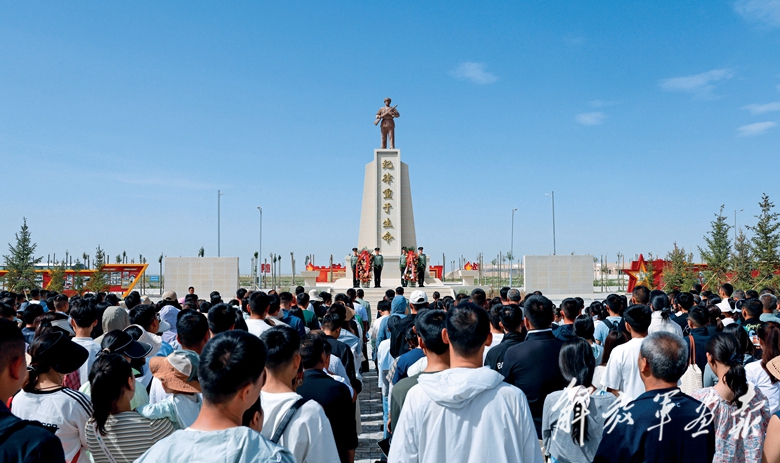 在邱少云烈士雕像前肃立默哀,表达对革命先烈的深切缅怀和崇高敬意。