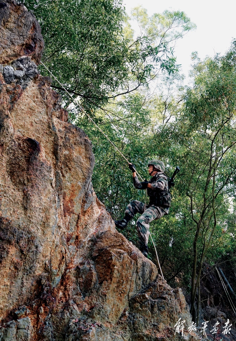 特战队员攀登崖壁,抵近侦察。