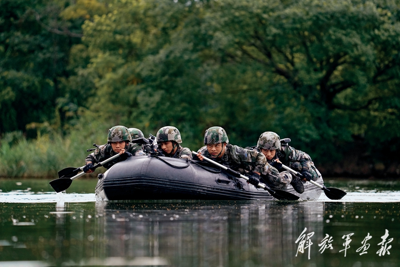 特战队员乘橡皮舟向“敌”阵地隐蔽渗透。