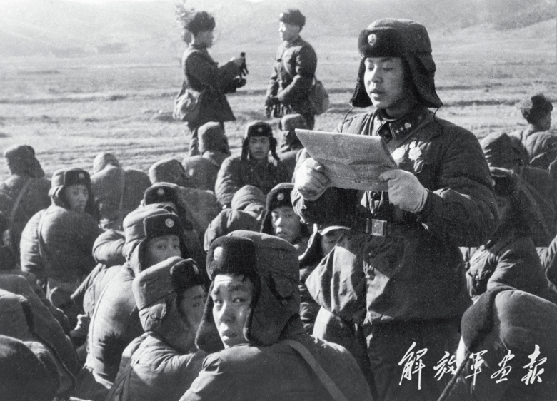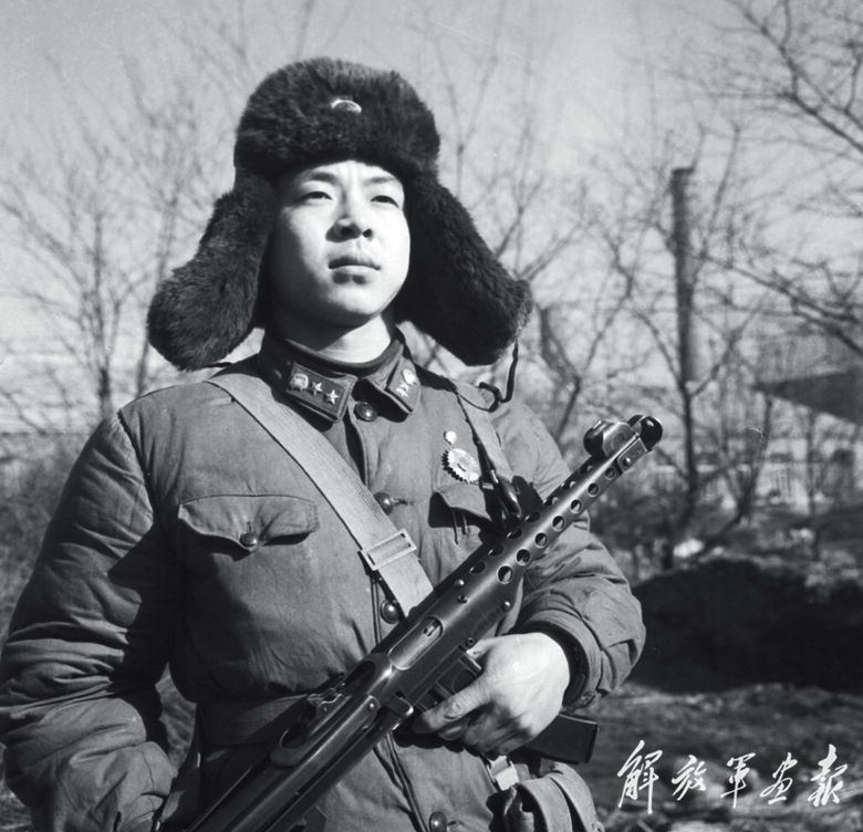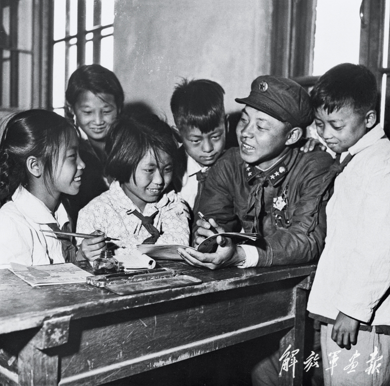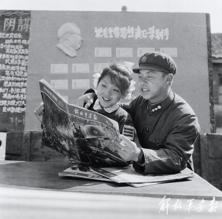 1962年,雷锋和抚顺市本溪路小学的少先队员陈亚娟一起阅读《解放军画报》。