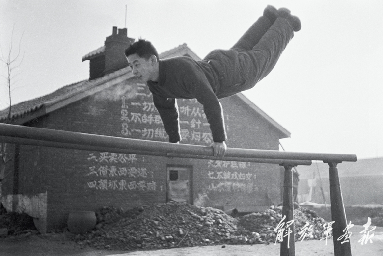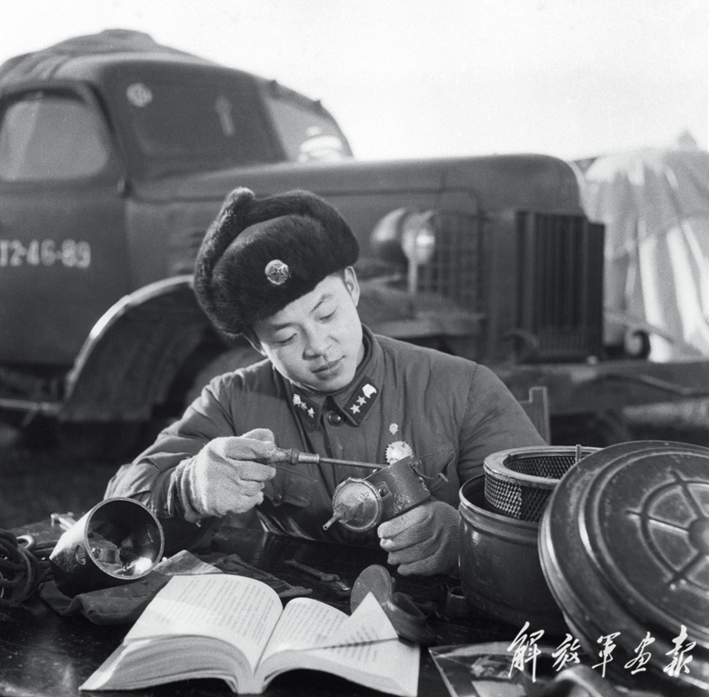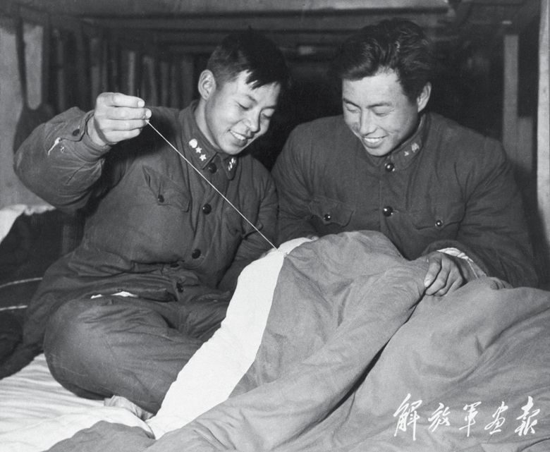 雷锋处处关心同志,助人为乐。图为他帮助战友缝被子。
