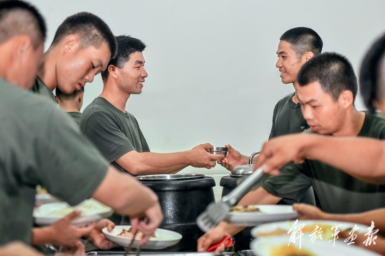 连长为新下连战士端上一碗热汤。