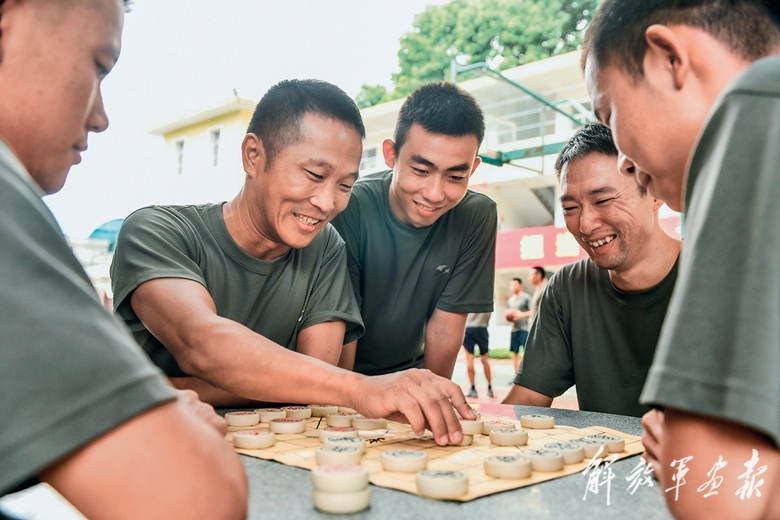 业余时间,官兵在一起下棋娱乐。