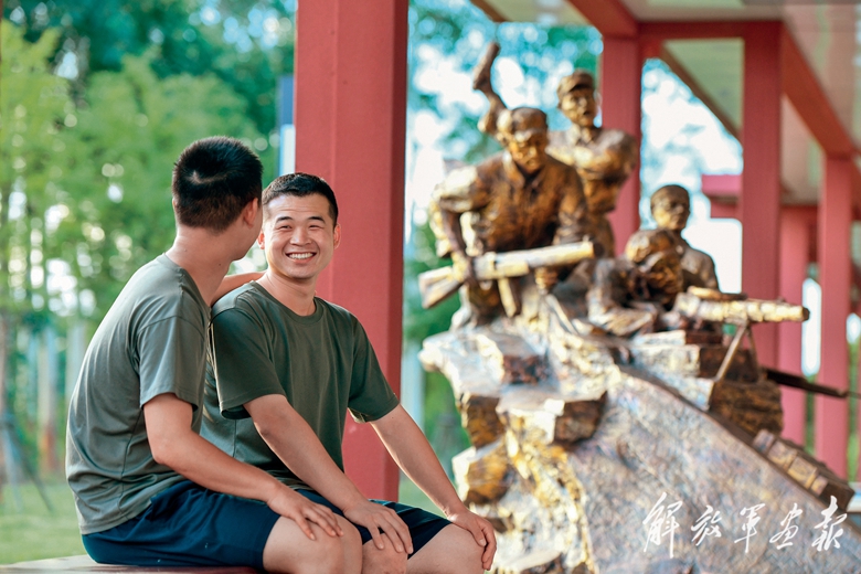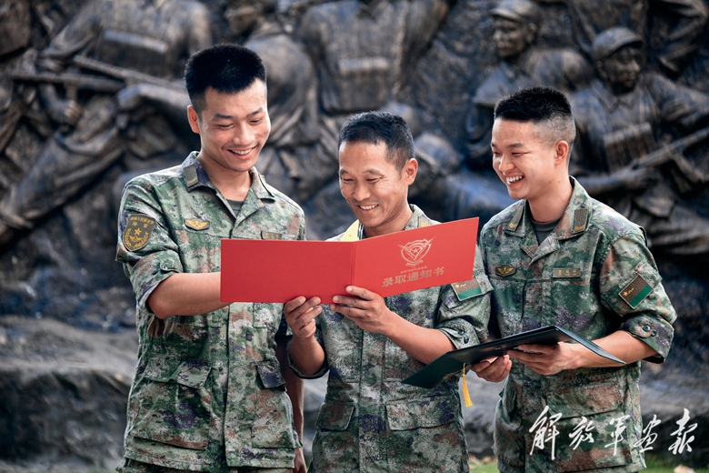 战士收到军校录取通知书,第一时间将好消息与班长(中)分享。