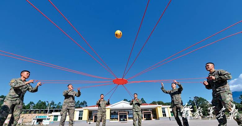 官兵在周末开展“击鼓传球”游戏,增强团队协作精神。