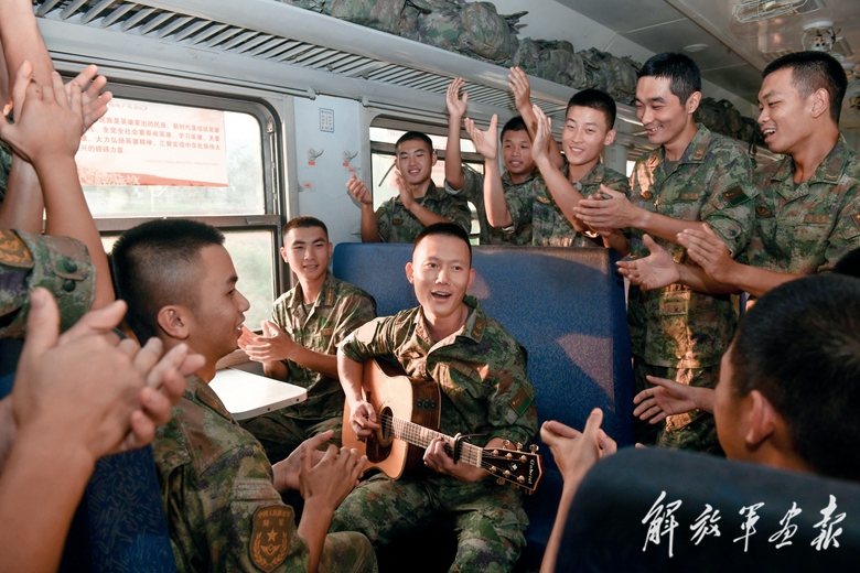 机动途中,官兵在车厢里即兴弹唱活跃氛围。