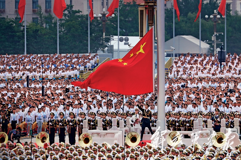 7万多人会聚的天安门广场上,人们手中舞动着的国旗、党旗交相辉映,广场成为红色的海洋。