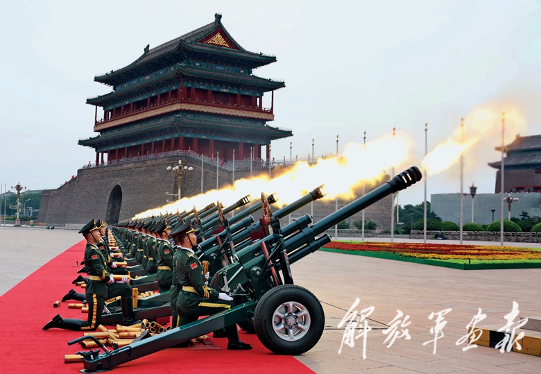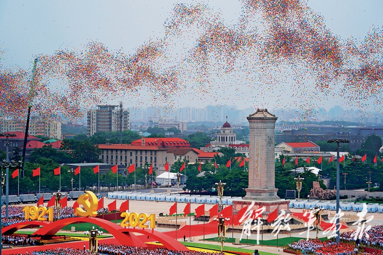 广场南端,100声礼炮响彻云霄,仿佛从历史深处传来,致敬党的百年光辉历程;