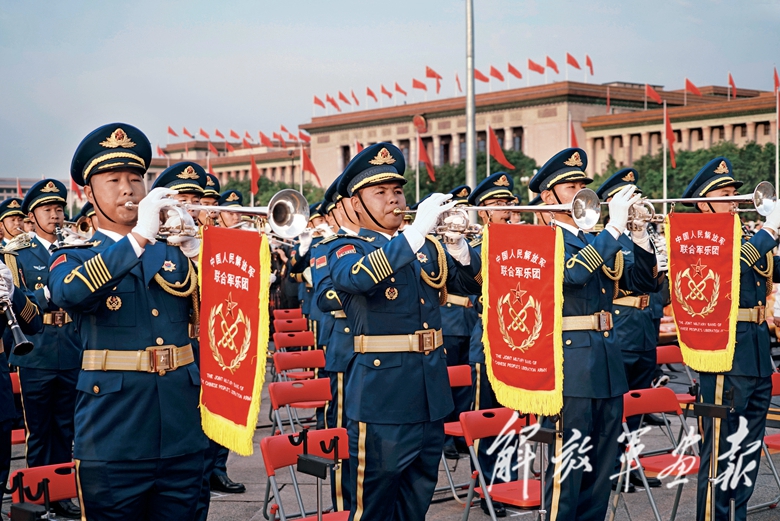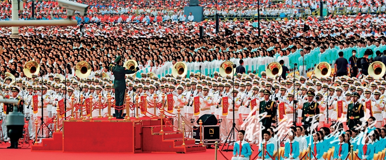 8时8分,1314人组成的中国人民解放军联合军乐团奏响中华人民共和国国歌,全场起立齐声高唱。