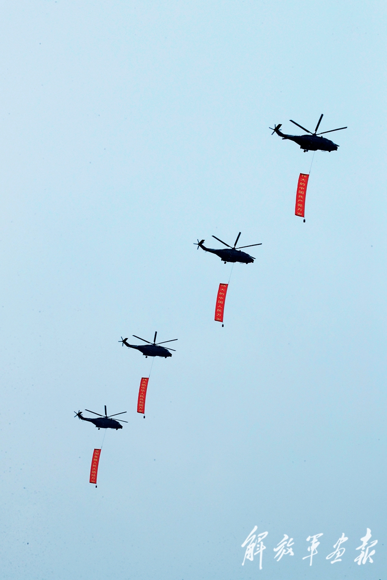 沿着党旗指引的方向,4架直升机分别悬挂4面巨幅标语紧随其后:“伟大的中国共产党万岁”“伟大的中国人民万岁”“伟大的中华人民共和国万岁”“全国各族人民大团结万岁”。
