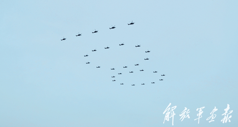 29架直升机汇成的巨大“100”字样掠过苍穹,象征党走过百年光辉历程;10架歼-10飞机组成“71”字样轰鸣而至,向党送上生日祝福。