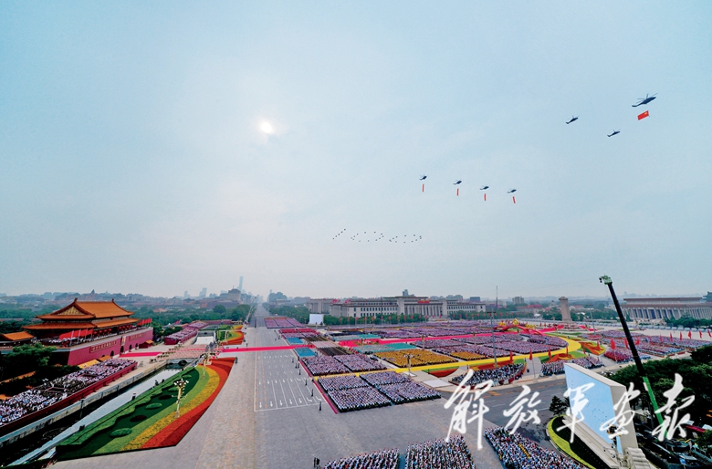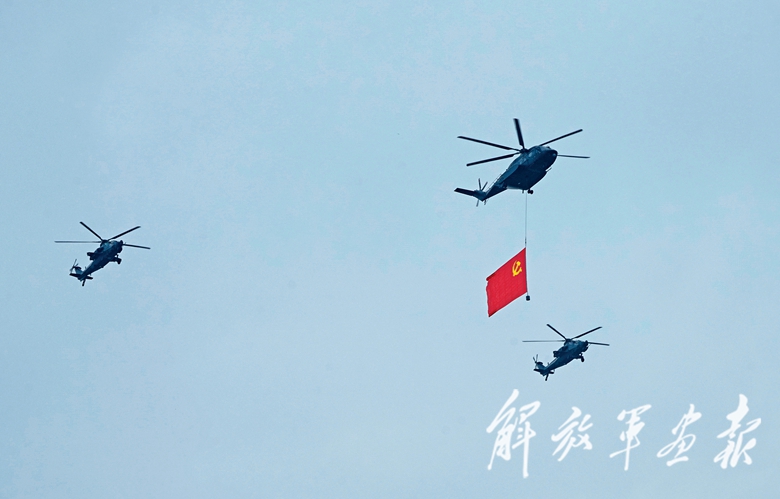 鲜红的中国共产党党旗,由直升机护旗梯队护卫,迎风向前。
