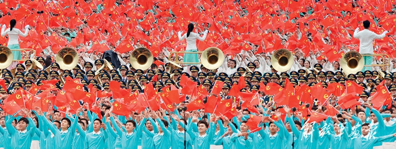 广场上激荡着嘹亮的歌声,鲜艳夺目的五星红旗冉冉升起、迎风飘扬。中轴线上,金黄色党徽格外闪亮。
