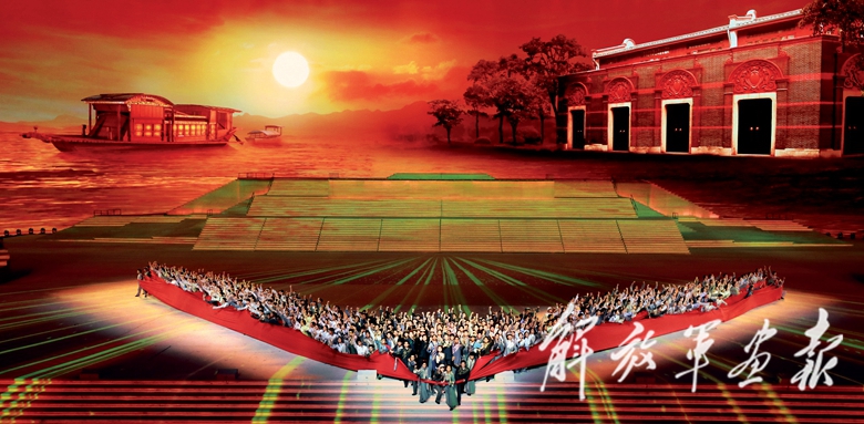 1921年,中国共产党诞生,仿佛一轮“红日”跃然升起,四射的光芒照亮整个舞台。