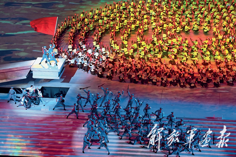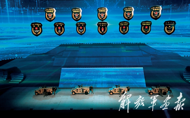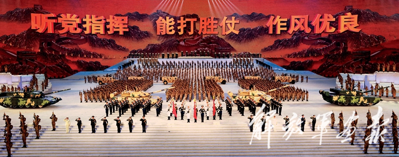 在节目《强军战歌》中,新式战车驶过舞台,三军将士英姿勃发,“听党指挥、能打胜仗、作风优良”的宣誓铿锵有力。