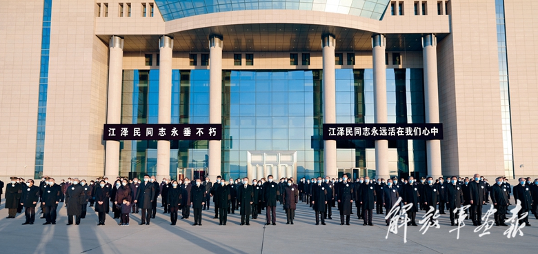 北京西郊机场国旗半垂,气氛庄严肃穆,黑底白字横幅上写着:“江泽民同志永垂不朽”“江泽民同志永远活在我们心中”。习近平和夫人彭丽媛等胸佩白花、臂戴黑纱,神情凝重地在停机坪肃立。