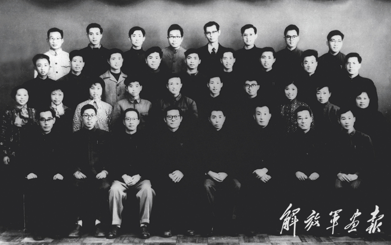 1963年3月,江泽民同志(前排右五)在上海同小型三相异步电机全国统一系列设计领导小组成员合影。