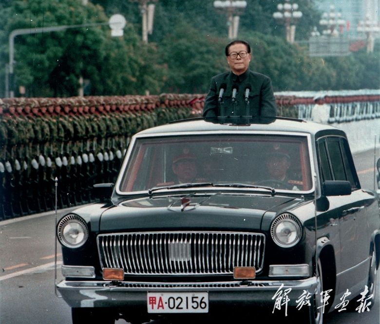 1999年10月1日,中华人民共和国成立五十周年盛大庆典在北京天安门广场举行。江泽民同志检阅由人民解放军陆海空三军和人民武装警察部队、民兵预备役部队组成的地面方队。