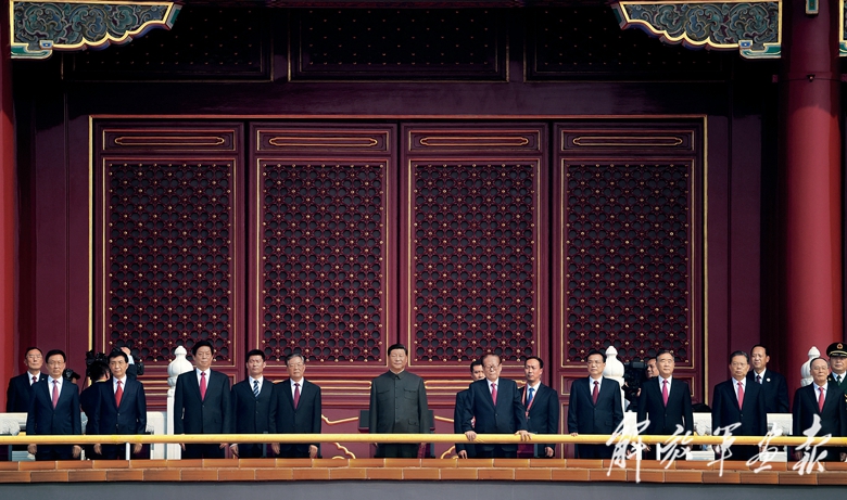 2019年10月1日,庆祝中华人民共和国成立70周年大会在北京天安门广场隆重举行。这是习近平同志、江泽民同志、胡锦涛同志等在天安门城楼上。