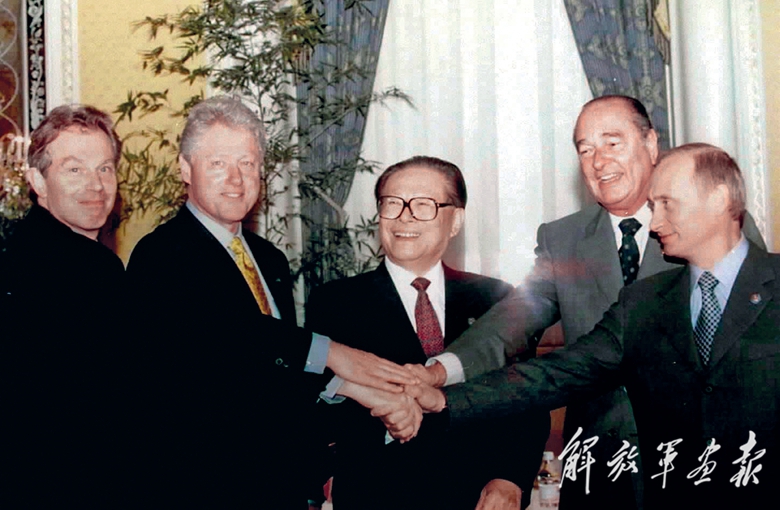 2000年9月7日,由中国倡议的联合国安理会五个常任理事国首脑会议在纽约举行。江泽民同志(中)同法国总统希拉克(右二)、俄罗斯总统普京(右一)、英国首相布莱尔(左一)、美国总统克林顿(左二)握手合影。