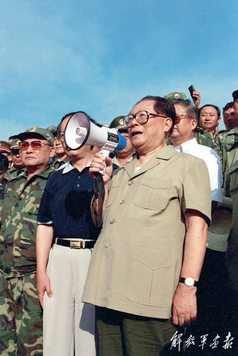 1998年8月13日至14日,江泽民同志亲赴湖北长江抗洪抢险第一线,看望、慰问、鼓励奋战在抗洪抢险第一线的广大军民,指导抗洪抢险斗争。这是8月13日江泽民同志在洪湖市乌林镇中沙角险段大堤上,向正在抗洪抢险的军民发表讲话。