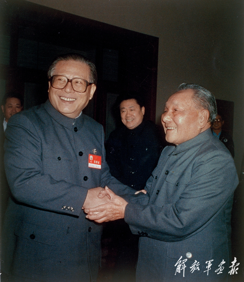 1989年11月6日至9日,中国共产党第十三届中央委员会第五次全体会议在北京召开。这是邓小平同志和江泽民同志亲切握手。