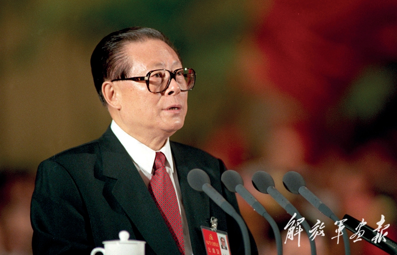 1997年9月,在中国共产党第十五次全国代表大会上,江泽民作题为《高举邓小平理论伟大旗帜,把建设有中国特色社会主义事业全面推向二十一世纪》的报告,着重阐述邓小平理论的历史地位和指导意义,提出党在社会主义初级阶段的基本纲领,明确公有制为主体、多种所有制经济共同发展是我国社会主义初级阶段的一项基本经济制度,强调依法治国、建设社会主义法治国家,明确我国改革开放和现代化建设跨世纪发展的宏伟目标。在中共十五届一中全会上,江泽民当选为中共中央政治局常委、中央委员会总书记,全会决定江泽民为中共中央军事委员会主席。1998年3月,在九届全国人大一次会议上,江泽民当选为中华人民共和国主席和中华人民共和国中央军事委员会主席。
