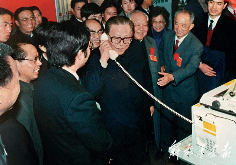 1984年5月,江泽民同志在北京展览馆举行的全国电子新产品展览会上,试用国际长途电话向远方的工作人员问候。