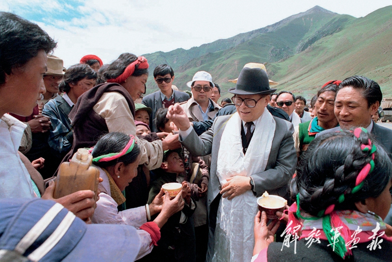 1990年7月25日,江泽民同志与藏族群众共庆望果节。