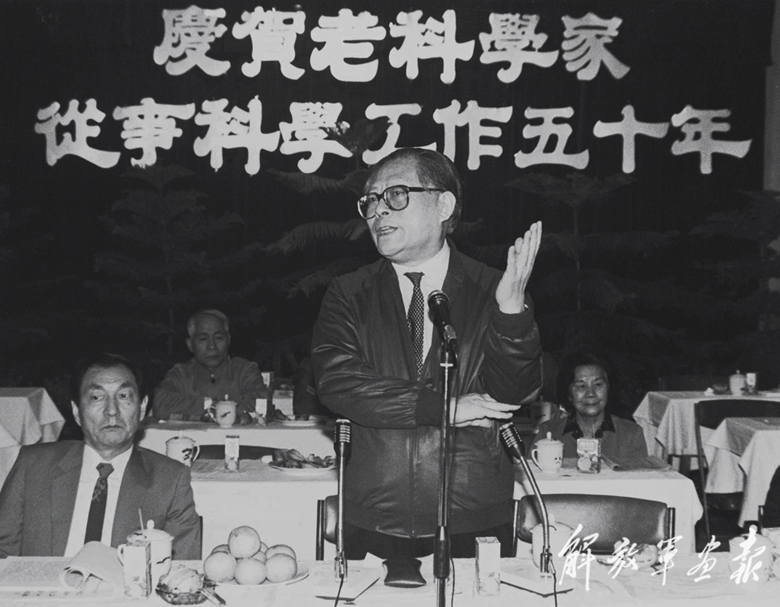 1988年10月,江泽民同志在上海庆贺老科学家从事科学工作五十年座谈会上讲话。