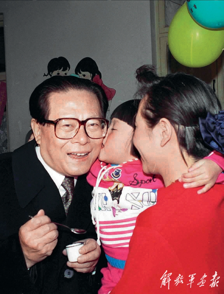 1993年12月5日,江泽民同志在北京为一位幼儿园儿童喂服脊髓灰质炎疫苗后,小朋友亲吻江爷爷。