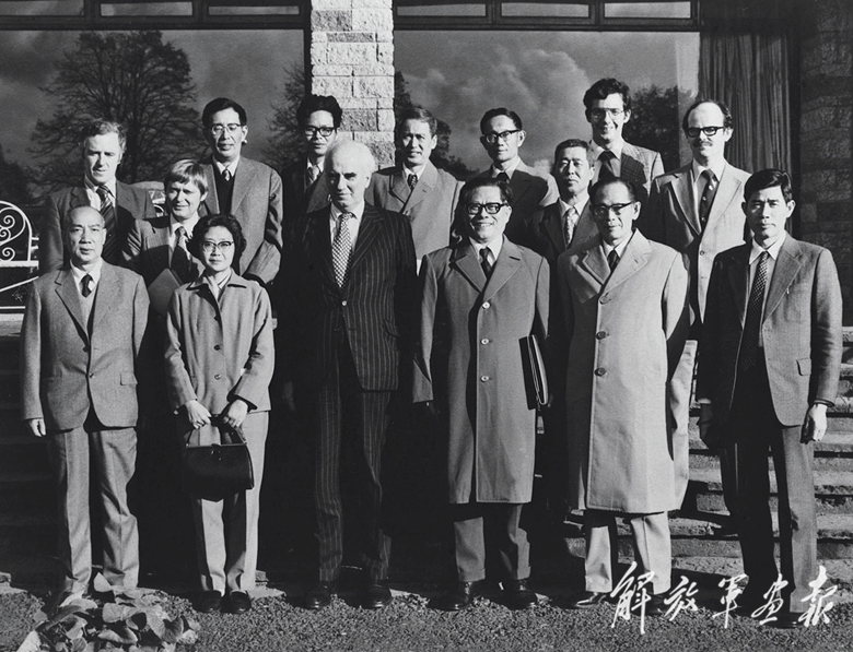 1980年10月底,江泽民同志(前排右三)在爱尔兰香农开发区考察时同开发区负责人等合影。