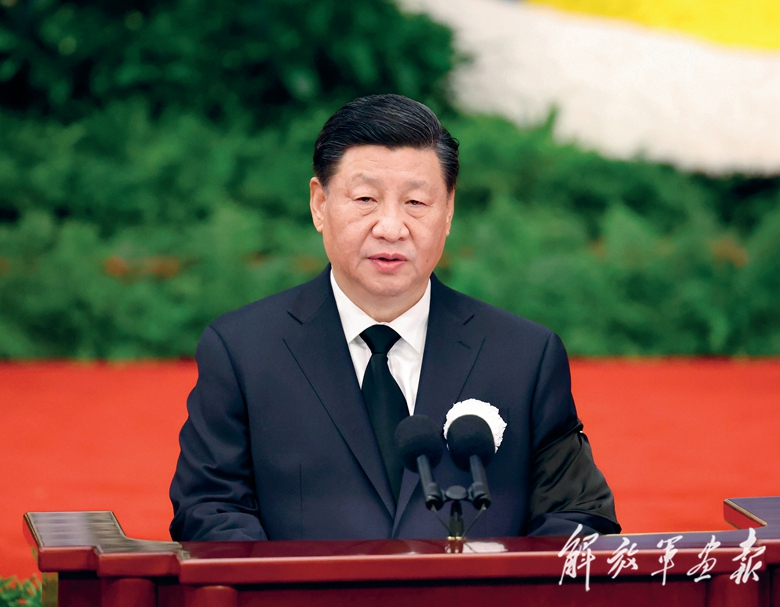 在全场凝重的气氛中,习近平致悼词。习近平在悼词中高度评价了江泽民同志光辉的一生和建立的丰功伟绩。他指出,从党的十三届四中全会到党的十六大的13年中,国际形势风云变幻,我国改革开放和社会主义现代化建设进程波澜壮阔。在国际国内十分复杂的形势下,江泽民同志带领党的中央领导集体,高举马克思列宁主义、毛泽东思想、邓小平理论伟大旗帜,坚持党的基本路线不动摇,紧紧依靠全党全军全国各族人民,坚定不移坚持和发展中国特色社会主义。江泽民同志深刻洞察世界新军事变革的发展趋势,主持制定了新时期军事战略方针,强调要推进中国特色军事变革,坚定不移走中国特色的精兵之路,加强人民军队革命化、现代化、正规化建设。在江泽民同志亲自领导和大力推动下,我国国防和军队现代化建设取得了巨大成就。江泽民同志集中全党智慧创立了“三个代表”重要思想,进一步回答了什么是社会主义、怎样建设社会主义的问题,创造性回答了建设什么样的党、怎样建设党的问题,深化了我们对新的时代条件下推进中国特色社会主义事业、加强党的建设的规律的认识,以新的思想、观点、论断,继承、丰富、发展了马克思列宁主义、毛泽东思想、邓小平理论。