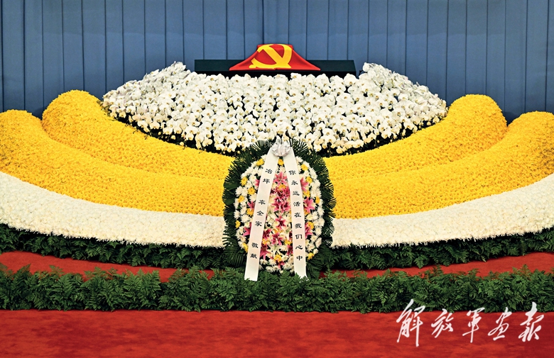 江泽民同志的骨灰盒安放在遗像前的鲜花翠柏丛中,骨灰盒上覆盖着鲜红的中国共产党党旗。江泽民同志的夫人王冶坪率全家敬献的花篮摆放在江泽民同志的骨灰盒前。(摄影/新华社记者 殷博古)