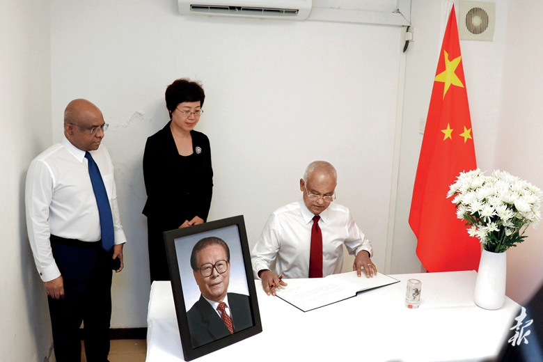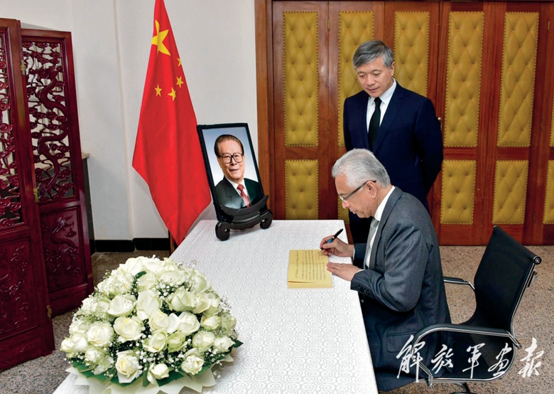 12月2日,毛里求斯总理贾格纳特在中国驻毛里求斯大使馆吊唁江泽民同志。(中国驻毛里求斯大使馆供图)