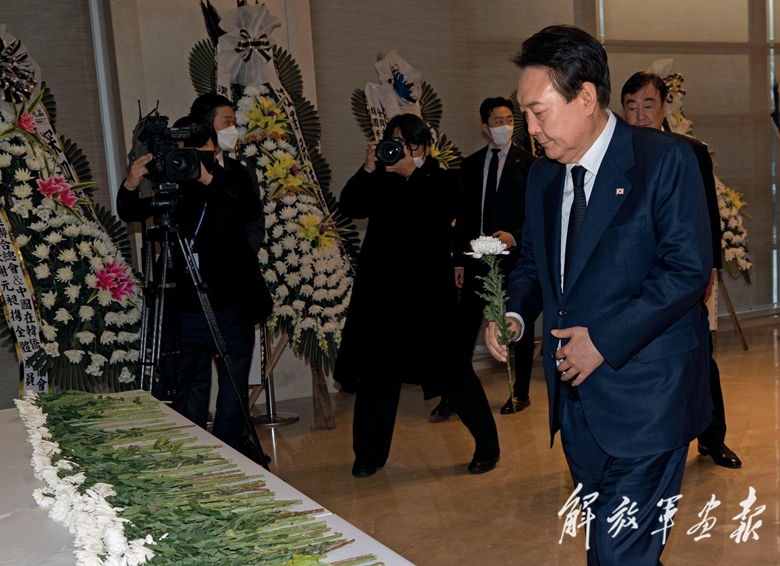 12月2日,韩国总统尹锡悦在中国驻韩国大使馆吊唁江泽民同志。(摄影/李相浩)