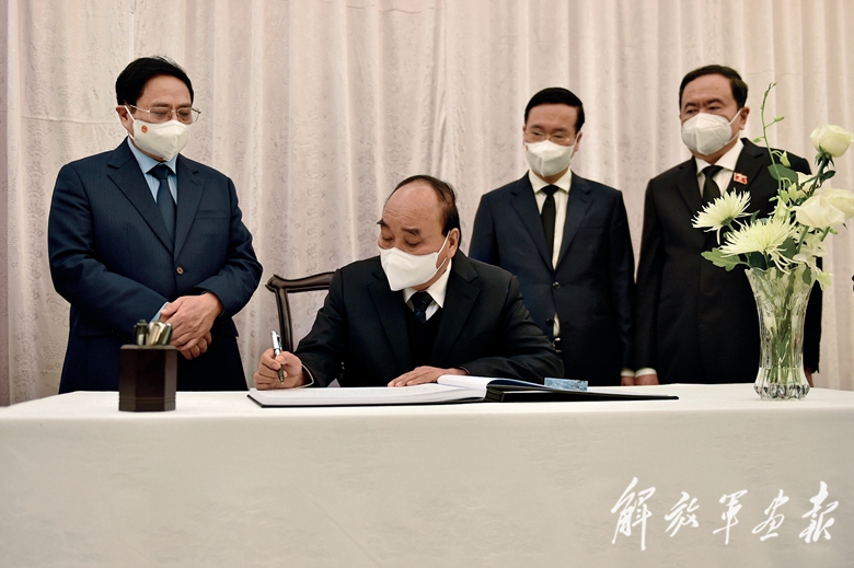 12月2日,越南国家主席阮春福(左二)、总理范明政(左一)等在中国驻越南大使馆吊唁江泽民同志。(摄影/新华社记者 胡佳丽)