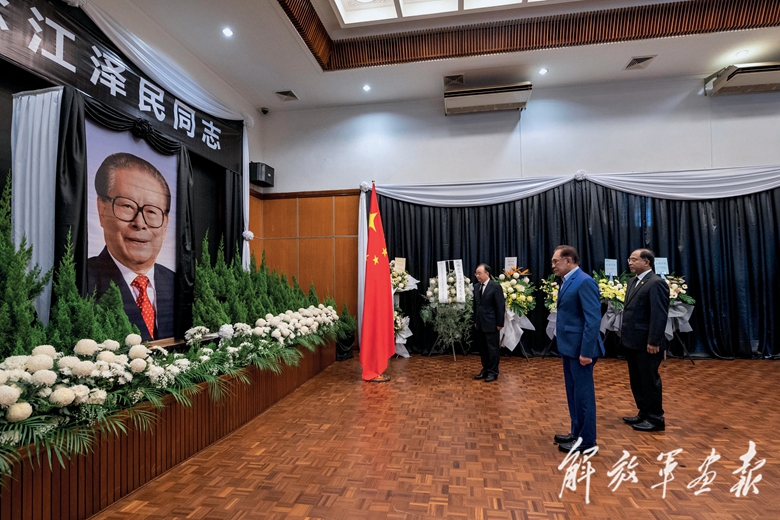 12月6日,马来西亚总理安瓦尔(右二)在中国驻马来西亚大使馆吊唁江泽民同志。(摄影/张纹综)